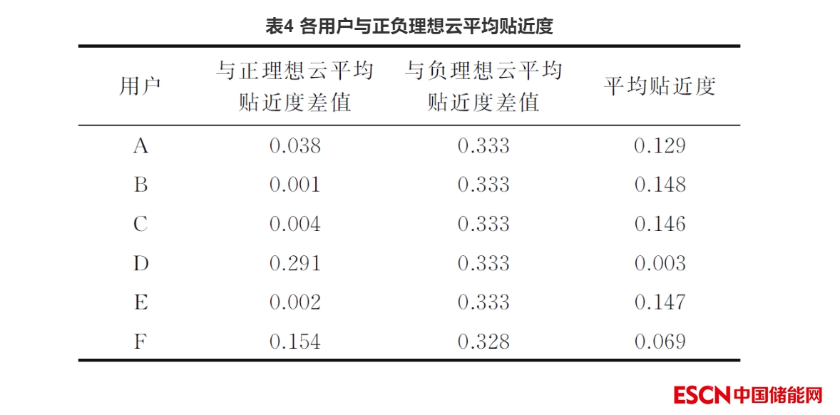 計(jì)算各用戶基本概率分配與正負(fù)理想云基本概率分配的平均貼近度如表4所示。