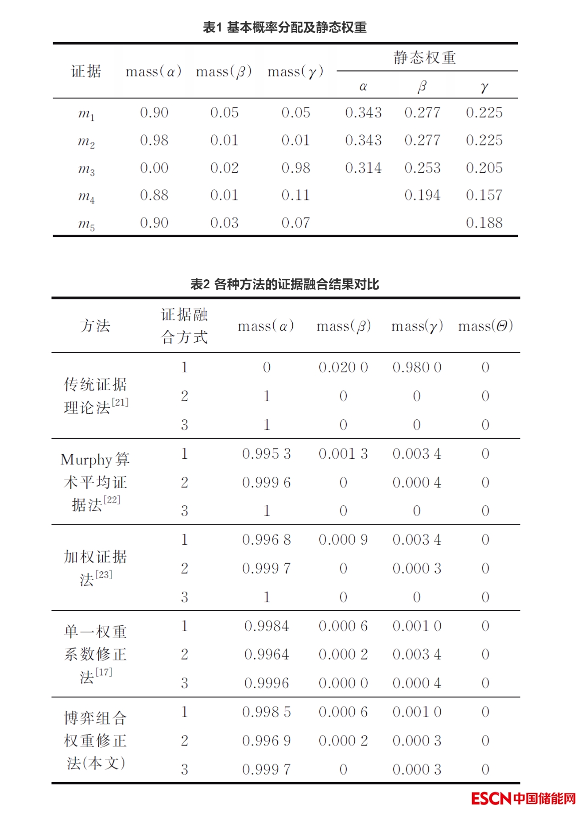 對(duì)此,本文將靜態(tài)權(quán)重、動(dòng)態(tài)權(quán)重進(jìn)行博弈組合,得到的組合權(quán)重能夠更科學(xué)精準(zhǔn)地識(shí)別沖突證據(jù),同時(shí)保留了原始非沖突信息。由表2可知,本文方法對(duì)于強(qiáng)沖突性的證據(jù)體m1⊕m2⊕m3⊕m4⊕m5融合結(jié)果為mass(γ)=0.000 3,表明對(duì)于焦元γ也分配了相應(yīng)的概率,而前3種方法由于在處理強(qiáng)沖突性上的缺陷,使得焦元γ的概率分配為0,與直觀判斷不一致。單一權(quán)重系數(shù)修正法對(duì)于焦元γ也分配了一定的概率,表明其在處理強(qiáng)沖突證據(jù)方面具有一定的優(yōu)勢(shì),但本文方法的融合結(jié)果顯示mass(α)=0.999 7,相較于單一權(quán)重系數(shù)修正法,焦元α得到了更高的概率分配,從而使得修正結(jié)果更為理想,由此驗(yàn)證了本文方法的有效性與優(yōu)越性。