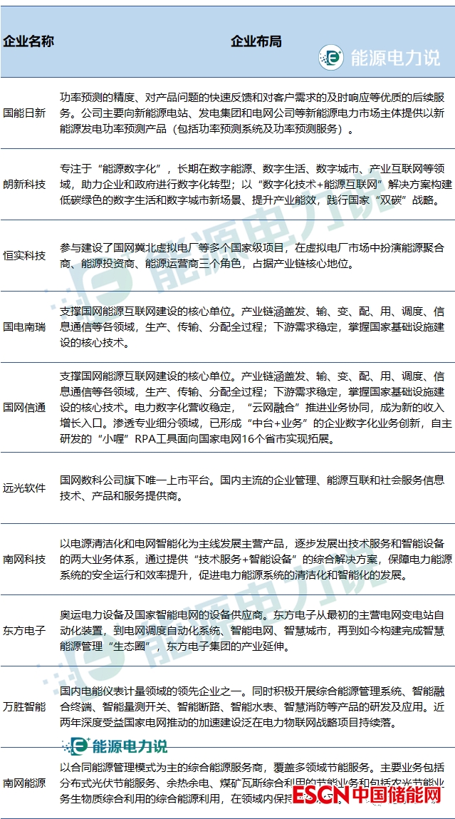 國(guó)內(nèi)市場(chǎng)來(lái)看,參與虛擬電廠項(xiàng)目的主要三類,一是虛擬電廠軟件平臺(tái)服務(wù)商,為電網(wǎng)公司虛擬電廠搭建軟件平臺(tái)的公司,如國(guó)能日新、國(guó)電南瑞、國(guó)網(wǎng)信通、東方電子、遠(yuǎn)光軟件、朗新科技。二是負(fù)荷聚合商,聚合長(zhǎng)尾需求側(cè)資源,提供需求側(cè)的電力預(yù)測(cè)曲線,并參與電網(wǎng)的需求側(cè)響應(yīng)獲取補(bǔ)貼分成,如恒實(shí)科技。三是如電享科技、國(guó)能日新等從新能源、新型儲(chǔ)能領(lǐng)域開(kāi)展虛擬電廠技術(shù)研發(fā)和布局的企業(yè)。