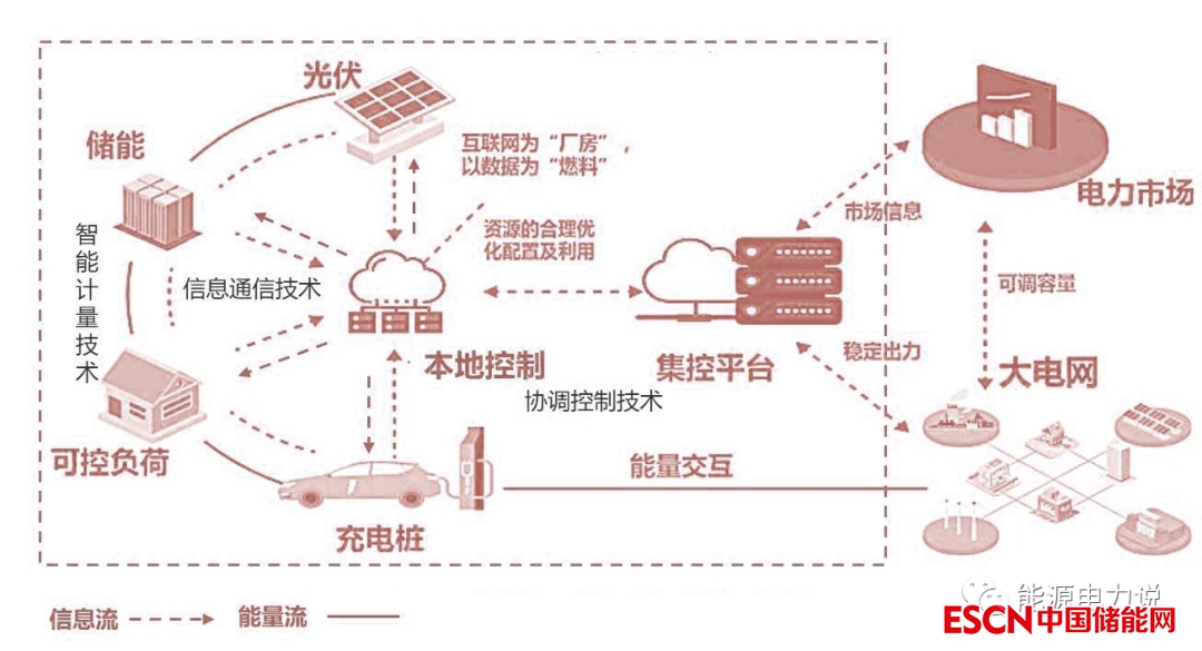 若規(guī)?;苯硬⑷腚娋W(wǎng)發(fā)電,將會(huì)對(duì)電網(wǎng)造成巨大沖擊,威脅電力系統(tǒng)安全以及供電的穩(wěn)定性。另外,由于小型分布式新能源發(fā)電設(shè)施、儲(chǔ)能設(shè)施、可控制用電設(shè)備、電動(dòng)汽車等的持續(xù)發(fā)展普及,在用電側(cè),很多電力用戶也從單一的消費(fèi)者轉(zhuǎn)變?yōu)榛旌闲螒B(tài)的產(chǎn)銷者,并且各類激增的大功率用電設(shè)備(如充電樁)“吃”起電來(lái),也是讓電網(wǎng)直呼壓力山大,顯然不能任由其“胃口大開(kāi)”一哄而上。因而,新的發(fā)用電勢(shì)態(tài)下,“虛擬電廠”應(yīng)運(yùn)而生。