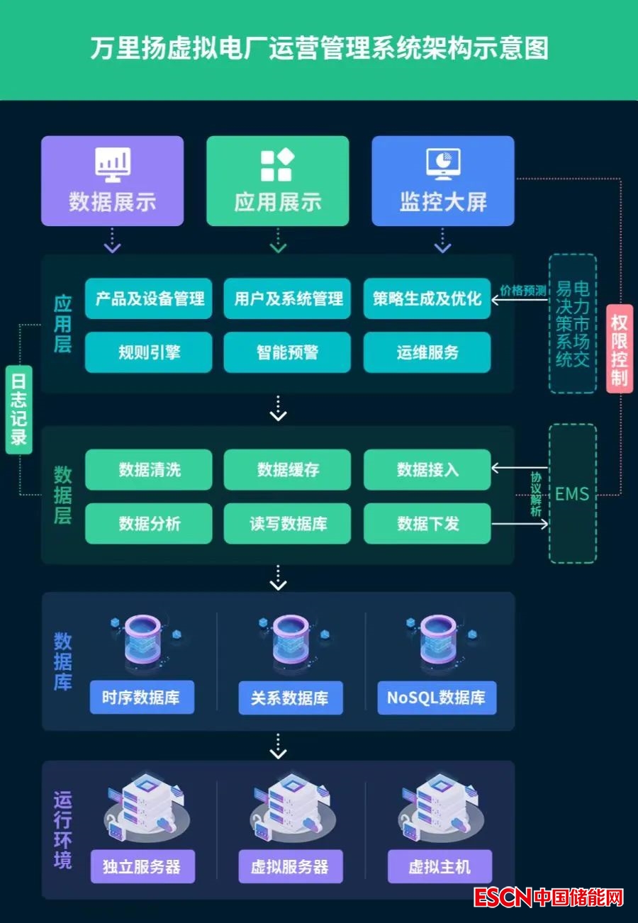 萬里揚(yáng)能源公司針對上述虛擬電廠業(yè)務(wù)場景進(jìn)行了全方位的剖析,構(gòu)建了萬里揚(yáng)虛擬電廠運(yùn)營管理系統(tǒng)的基本架構(gòu),包括運(yùn)行環(huán)境、數(shù)據(jù)庫、數(shù)據(jù)層、應(yīng)用層、展示層等,業(yè)務(wù)場景涵蓋設(shè)備監(jiān)視、系統(tǒng)管理、策略優(yōu)化、運(yùn)行控制、智能預(yù)警、運(yùn)維服務(wù)等多個方面,形成了面向多類資源、多個站點(diǎn)、多種市場的虛擬電廠集中運(yùn)營與控制。