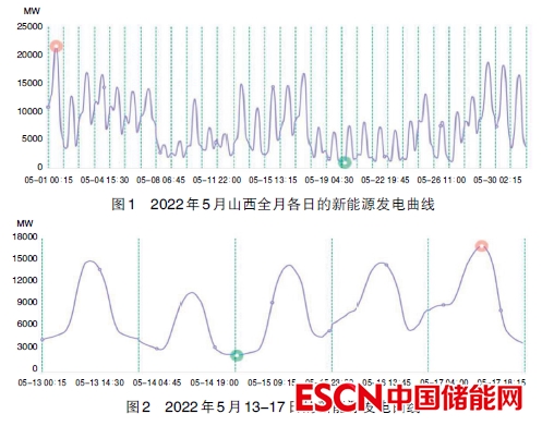 圖1展示了山西新能源在2022年5月各日的發(fā)電曲線,可以看出,1~7日平均發(fā)電量較多,8~12日平均發(fā)電明顯偏少,13~17日有所恢復,然后除了月底3天之外,剩下來的天數新能源發(fā)電都很少。