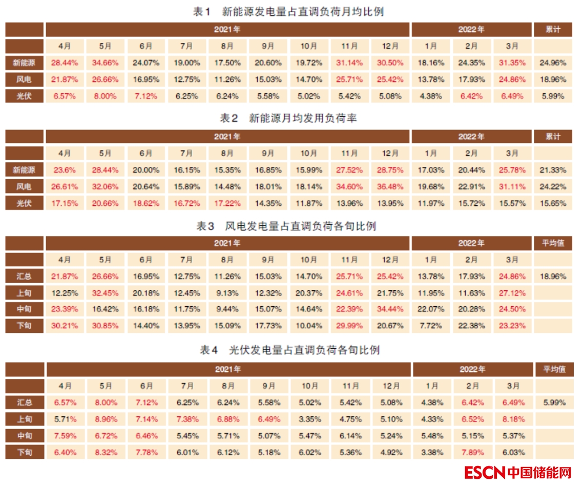 下面的表1展示的是新能源發(fā)電量占直調負荷用電量的比例,表2展示的是新能源自身的月均負荷率??梢钥吹?,新能源發(fā)電存在明顯的月度不均衡,從負荷率來說,風電在2021年4、5、11、12月以及2022年3月發(fā)電較多,遠超其他月份;光伏發(fā)電在2021年4、5、6、7、8月比較多,不同月份的相對量變化也非常大。