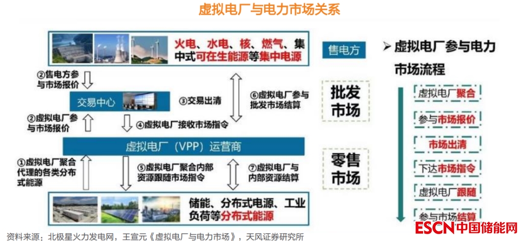 未來虛擬電廠或形成鏈接發(fā)電和用電的市場化閉環(huán),成為大電網(wǎng)體系外在電力市場中的重要參與方。虛擬電廠通過虛擬聚合、參與市場報價、市場出清、下達(dá)市場指令、虛擬電廠跟隨、參與市場結(jié)算等流程參與電力市場。未來若結(jié)合配電網(wǎng)、微電網(wǎng)、分布式光伏的市場化體系發(fā)電,有望形成大電網(wǎng)體系外的“配電”+“售電”市場化閉環(huán)。