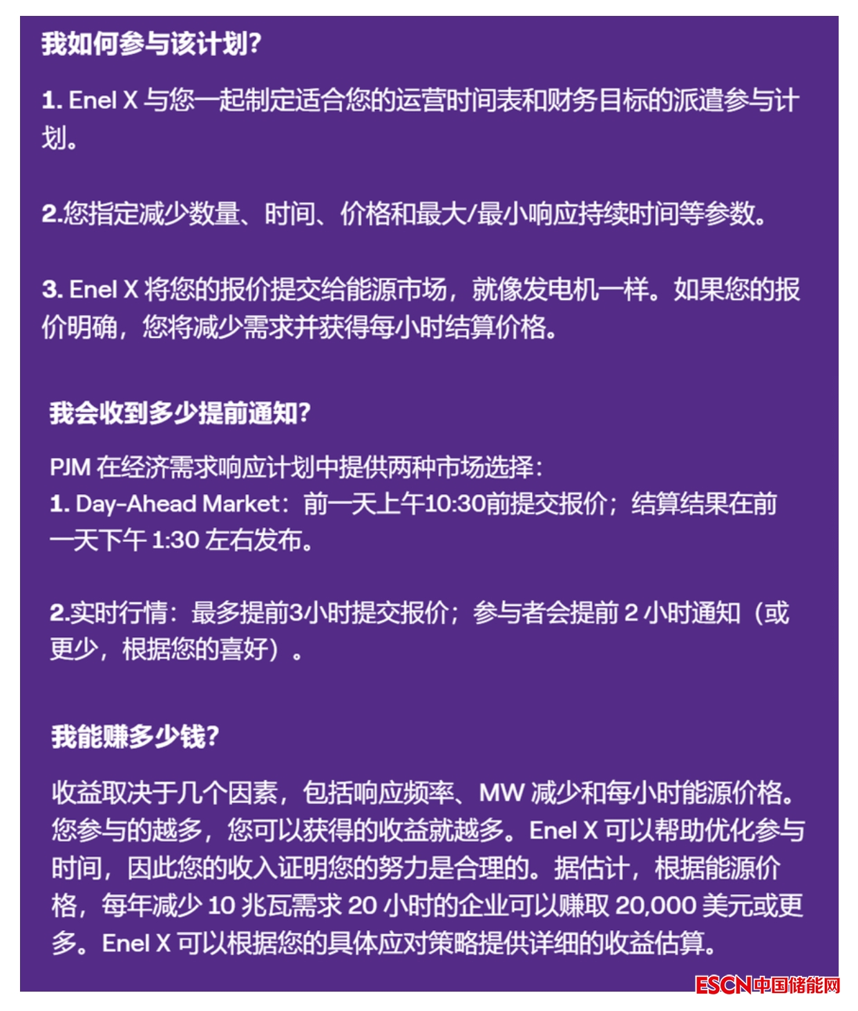 下面以一家名為EneX能源的CSP為例,它在給用戶的宣傳手冊(cè)中給出了需求響應(yīng)的參與要點(diǎn)。