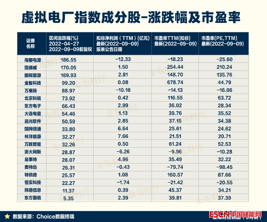 指數(shù)成分股中,4月27日至9月9日,有4個股票漲幅接近100%,包括南都電源(186%)、固德威(170%)、鵬輝能源(169%)和金智科技(99%)。