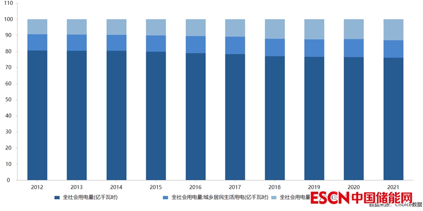 2012-2021年這十年里,中國用電結(jié)構(gòu)中,第三產(chǎn)業(yè)用電和城鄉(xiāng)居民生活用電兩者的比重不斷增加,兩者用電量合計由2012年的1.19萬億千瓦時上升至2021年的2.59萬億千瓦時;合計比重由2012年的24%上升至2021年的31.25%。