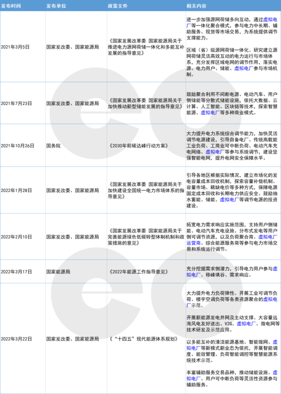2022年3月國家發(fā)改委、國家能源局發(fā)布的《“十四五”現(xiàn)代能源體系規(guī)劃》四次提及“虛擬電廠”。2022年2月發(fā)布的《國家發(fā)展改革委 國家能源局關(guān)于完善能源綠色低碳轉(zhuǎn)型體制機制和政策措施的意見》提出,拓寬電力需求響應(yīng)實施范圍,支持虛擬電廠運營商等參與電力市場交易和系統(tǒng)運行調(diào)節(jié)。此前,2021年10月,國務(wù)院發(fā)布的《2030年前碳達峰行動方案》,提出加快靈活調(diào)節(jié)電源建設(shè),引導(dǎo)虛擬電廠等多種資源參與系統(tǒng)調(diào)節(jié)。