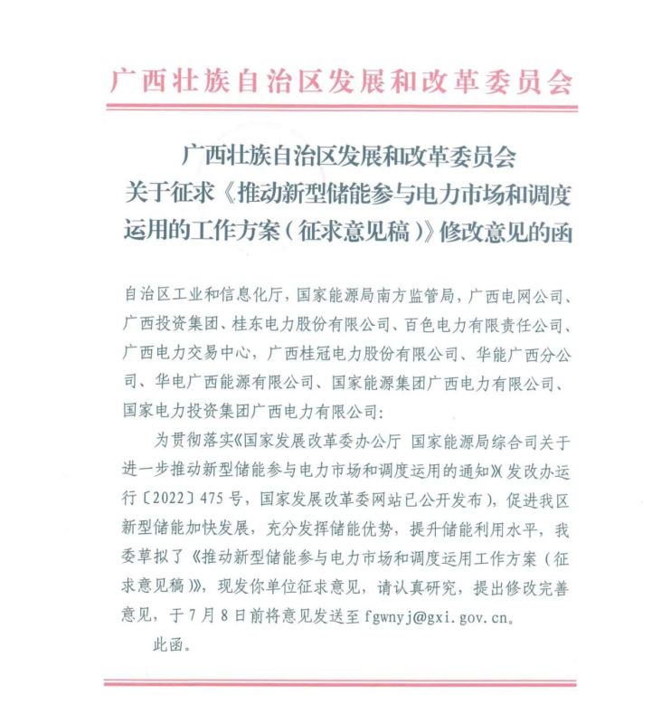 中國儲能網(wǎng)訊:近日,廣西自治區(qū)發(fā)改委發(fā)布了《推動新型儲能參與電力市場和調(diào)度運用工作方案(征求意見稿)》(以下簡稱《工作方案》)。