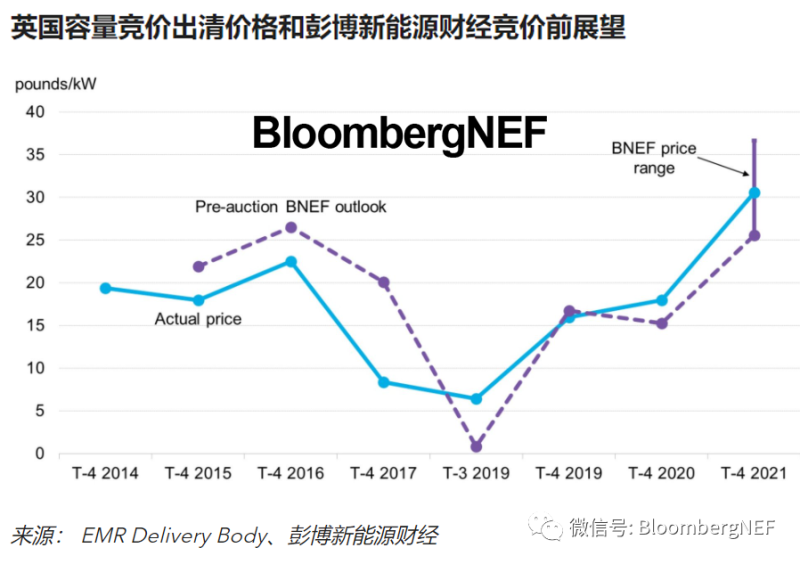 2022年2月22日,2021英國(guó)T-4容量競(jìng)價(jià)出清價(jià)格達(dá)創(chuàng)紀(jì)錄的30.59英鎊/kW。具備參與T-4競(jìng)價(jià)資格的競(jìng)標(biāo)總量下降至新低,這增加了滿足需求所需的新建電廠數(shù)量。這推高了出清價(jià)格——處于彭博新能源財(cái)經(jīng)在其競(jìng)價(jià)展望中給出的價(jià)格預(yù)測(cè)區(qū)間的中間水平——欲了解更多內(nèi)容,彭博新能源財(cái)經(jīng)正式訂閱客戶請(qǐng)查閱《2021年英國(guó)T-4容量競(jìng)價(jià)展望:供給短缺》。