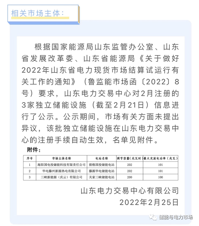 2022年2月25日,山東省電力交易中心對外公示,海陽國電投儲能科技有限責(zé)任公司、華電滕州新源熱電有限公司、三峽新能源(慶云)有限公司運營的獨立儲能電站,正式成為山東省電力現(xiàn)貨交易市場的主體。