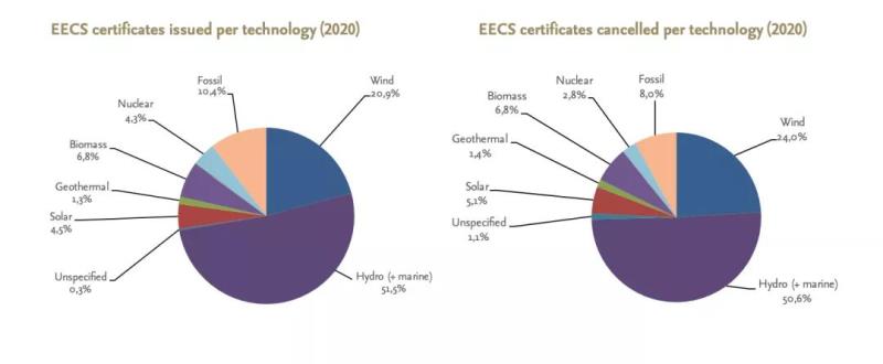歐洲的GO機(jī)制是在歐洲能源證書標(biāo)準(zhǔn)(EECS)體系下對(duì)電力來源進(jìn)行擔(dān)保,而不同國(guó)家認(rèn)可的品種不一,水電、風(fēng)電、光伏、生物質(zhì)發(fā)電是主要來源,有的國(guó)家也認(rèn)可核電和熱電聯(lián)產(chǎn)的燃?xì)獍l(fā)電。
