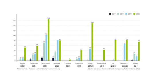 歐洲各國都出現(xiàn)過負電價,而且是逐年增多。德國2019年有101小時出現(xiàn)過負電價,2020年9月份已經(jīng)達到164小時。
