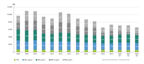 一般來說,可再生能源的比例越高,系統(tǒng)的波動性越大,系統(tǒng)平衡成本也越高。美國是這樣,英國和法國也都是如此,但德國卻是個特例。據(jù)德國網(wǎng)絡(luò)監(jiān)管部門統(tǒng)計,從2009年到2020年,德國平衡發(fā)電和用電的調(diào)頻功率非但沒有增加反而有所下降。