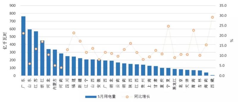 5月當(dāng)月,廣東(762億千瓦時)、山東(595億千瓦時)、江蘇(570億千瓦時)、浙江(453億千瓦時)、河北(342億千瓦時)用電量排名前五。全國23個省份的用電量增速超過10%。其中,西藏(29.2%)、寧夏(24.7%)、青海(22.7%)、福建(21.4%)、廣東(21.2%)等5個省份的用電量增速超過20%。貴州(8.1%)、安徽(8.0%)、山東(6.0%)、內(nèi)蒙古(5.1%)、河南(4.0%)用電量增速排名后五位。