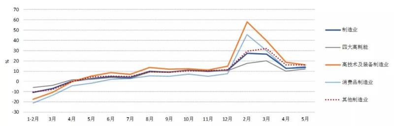 高技術(shù)及裝備制造業(yè)子行業(yè)用電量發(fā)展勢頭良好。受新冠肺炎疫情蔓延背景下國外訂單回流,我國對主要貿(mào)易伙伴出口大幅增長。根據(jù)海關(guān)總署發(fā)布的數(shù)據(jù),一季度,我國出口機電產(chǎn)品2.78萬億元,增長43%,占出口總值的60.3%,較去年同期提升1.7個百分點。其中,出口自動數(shù)據(jù)處理設(shè)備及其零部件、手機、汽車分別增長54.5%、38.5%、98.9%。從用電量看,2021年前5個月,高技術(shù)及裝備制造業(yè)用電量同比增長31.0%,其子行業(yè)中,電氣機械器材制造業(yè)、汽車制造業(yè)、通用設(shè)備制造業(yè)及儀器儀表制造業(yè)用電量增速超過30%,汽車制造業(yè)增速最高為42.3%。1~5月份,高技術(shù)及裝備制造業(yè)用電量兩年平均增速10.2%,其中計算機、通信和其他電子設(shè)備制造業(yè)兩年平均增速最高為19.2%,汽車制造業(yè)兩年平均增速為16.5%。