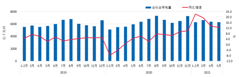 今年前5個月,全國全社會用電量累計32305億千瓦時,同比增長17.7%,較上年同期增速增長7.9個百分點。從兩年同期平均增速看,年均增長7.4%,較2019年同期增長2.5個百分點。