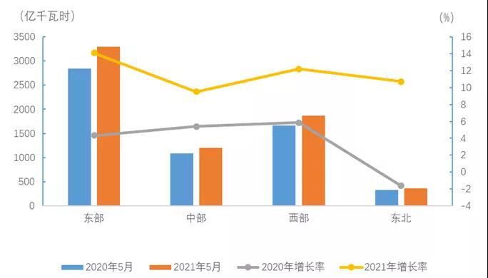 5月份,東、中、西部和東北地區(qū)全社會用電量增速分別為14.1%、9.5%、12.2%和10.7%。