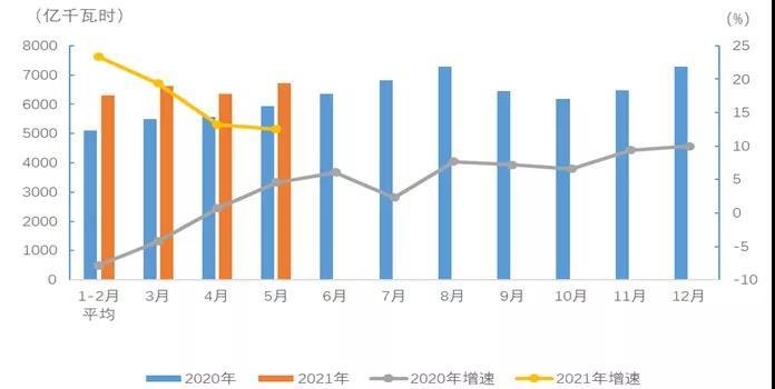 1-5月,全國全社會用電量32305億千瓦時,同比增長17.7%,其中,5月份全國全社會用電量6724億千瓦時,同比增長12.5%。