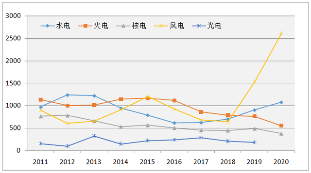 圖20 2011~2020年不同電源投資情況(單位:億元)