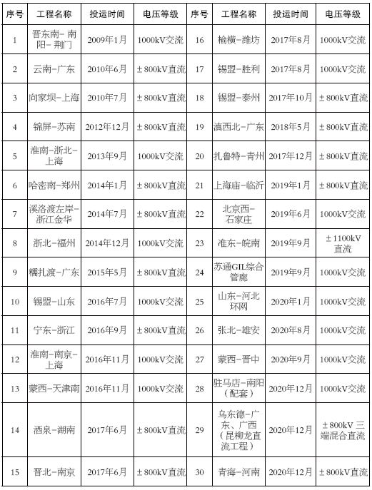 表6 我國(guó)已建成投運(yùn)特高壓工程