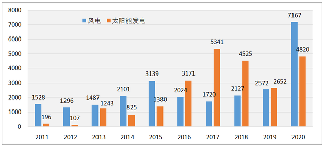 圖9 2011~2020年風(fēng)光發(fā)電新增裝機(jī)情況(單位:萬(wàn)千瓦)