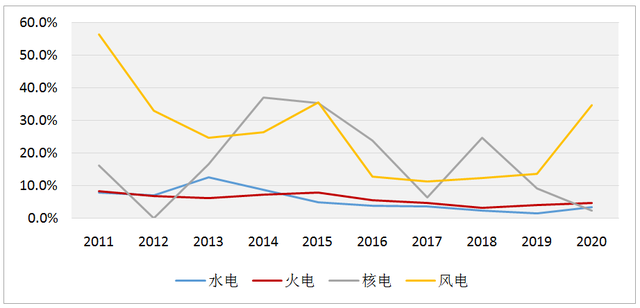 圖5 2011~2020年水電、火電、核電、風(fēng)電裝機(jī)增速情況(單位:%)