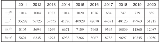 表1 2011~2020年分產(chǎn)業(yè)用電量(單位:億千瓦時(shí))