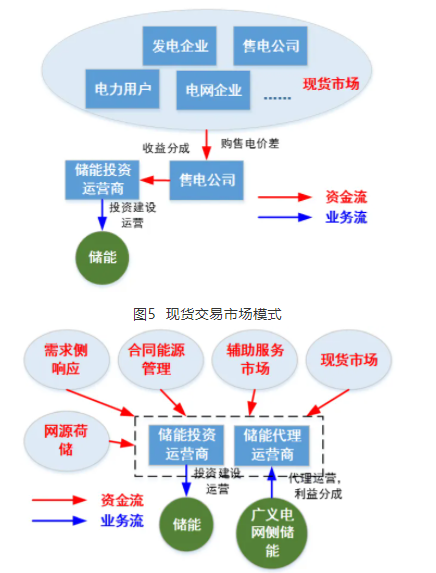競爭性業(yè)務(wù)模式適用于提供調(diào)頻等輔助服務(wù)、移峰填谷和提高新能源利用水平三類場景的電網(wǎng)側(cè)儲能應(yīng)用,按照投資回收方式不同,該商業(yè)模式又可細(xì)分為合同能源管理模式、兩部制電價模式、輔助服務(wù)市場模式、現(xiàn)貨交易市場模式和綜合模式。競爭性業(yè)務(wù)模式由可參與市場競爭的社會資本投資,業(yè)務(wù)受輸配電價監(jiān)管的電網(wǎng)主業(yè)不允許投資。各商業(yè)模式的關(guān)系示意圖如圖2~圖6所示。