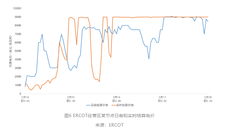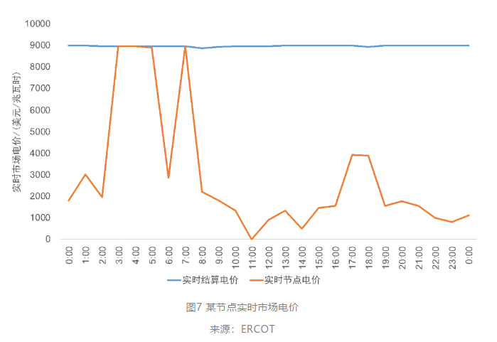 在上述因素影響下,除發(fā)生大面積停電事故外,更帶來燃料價格與電力價格的全面快速上漲。ECROT披露的信息顯示,天然氣價格已超過180美金/mmbtu,導(dǎo)致市場價格帽LCAP (Low System Wide Offer Cap) 失效,日前和實(shí)時市場在出清階段已突破9000美元/MW的市場限價,必須強(qiáng)制使用HCAP(High System-Wide Offer Cap)以避免現(xiàn)貨市場結(jié)算價格超出9000美元/MW的限價,如圖6所示。