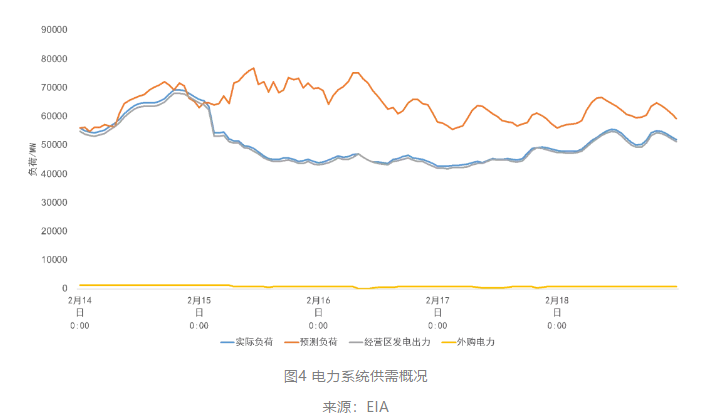 受到極端天氣影響下,天然氣輸運(yùn)裝置被凍結(jié),供氣能力受限,作為主要電源品種的燃?xì)獍l(fā)電燃料供給緊張;部分煤電機(jī)組服役年限過長,極寒天氣下故障頻發(fā);位于得州西北部的風(fēng)電機(jī)組因凍結(jié)無法正常運(yùn)行。ECROT負(fù)責(zé)人在接受采訪時表示,盡管針對冬季寒冷可能誘發(fā)發(fā)電裝置停運(yùn)的隱患,ECROT已向經(jīng)營區(qū)內(nèi)發(fā)電商提出過預(yù)警,但并沒有引起發(fā)電商足夠重視。根據(jù)ECROT信息顯示,截止2月17日,共計(jì)1700萬千瓦的可再生能源裝機(jī)和2750萬千瓦的熱電機(jī)組無法并網(wǎng),分別占總裝機(jī)的16.8%和26.1%,造成最大約2900萬千瓦的供給缺口,如圖4所示。