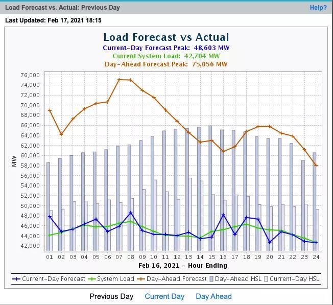 得州處于多氣候帶交匯地區(qū),南部地區(qū)冬季溫暖。以州首府奧斯汀為例,本次停電期間創(chuàng)近20年來2月中旬平均氣溫最低的紀(jì)錄,如圖2所示。由于當(dāng)?shù)囟静膳问街饕獮殡姽┡?,異常寒冷帶來的用電?fù)荷激增遠(yuǎn)超預(yù)期。根據(jù)ERCOT測算,異常低溫造成用電負(fù)荷激增,預(yù)測用電負(fù)荷將超過7500萬千瓦,創(chuàng)冬季用電負(fù)荷新高,如圖3所示。