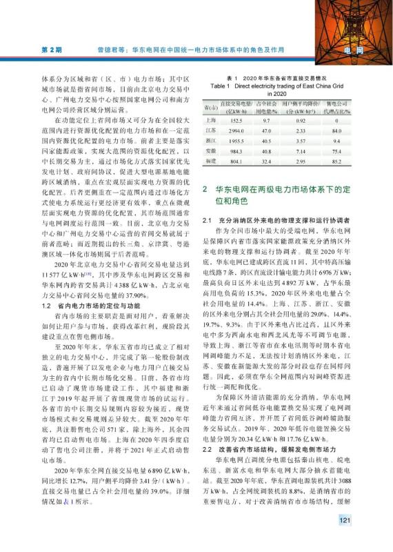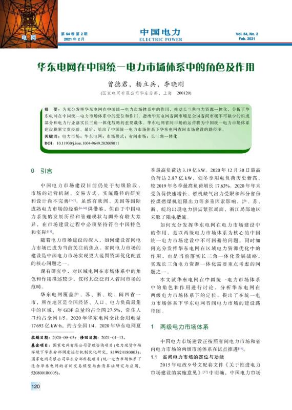 曾德君, 楊立兵, 李曉剛. 華東電網在中國統(tǒng)一電力市場體系中的角色及作用[J]. 中國電力, 2021, 54(2): 120-126.