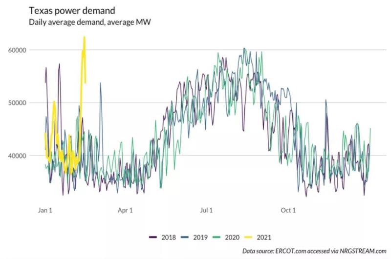 每有問題發(fā)生,普遍的反應(yīng)就是要找到罪魁禍?zhǔn)?。德州電荒的一個重要原因顯然是前所未有的寒冷天氣。下圖是德州近年來的用電需求走勢,可以看到2020年這幾天的用電高峰是前所未有的;而且寒潮導(dǎo)致近30GW的發(fā)電設(shè)施無法工作,也是前所未有的。