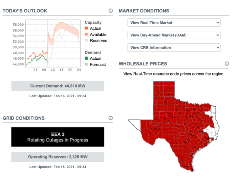 寒潮當(dāng)然是電荒的客觀原因,ERCOT在2月11號發(fā)布的新聞就預(yù)計,由于遭遇帶來數(shù)十年來最冷的天氣,德州的電力需求量將創(chuàng)歷史新高。德州的電力市場化程度很高,點擊http://www.ercot.com/就可以看到當(dāng)日實時的電力需求和預(yù)測、以及各地區(qū)的電力批發(fā)價格。注意電力批發(fā)價格是發(fā)電廠提供給電力零售商的價格,之后再由零售商銷售給消費者。