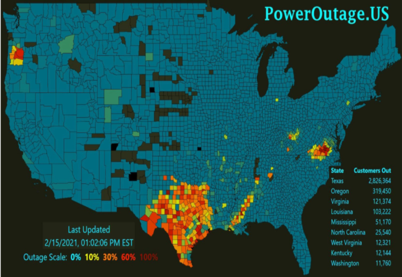 中國儲能網(wǎng)訊:最近幾天,美國大部分地區(qū)經(jīng)歷了罕見的大規(guī)模寒潮天氣。在寒潮影響下,美國德克薩斯州電力批發(fā)市場上電力價格超過了$9/度。當(dāng)?shù)貢r間的2月15日,德克薩斯州電力可靠性委員會(ERCOT,負責(zé)電網(wǎng)運行和管理電力批發(fā)市場的調(diào)度)宣布進入緊急狀態(tài),并于15日凌晨1:25開始輪流停電(rotating outages)。這一事件引發(fā)了能源界和氣候界的廣泛關(guān)注,其中關(guān)于電力市場設(shè)計和可再生能源電力的諸問題,對我國電力市場改革和可再生能源電力發(fā)展或有啟示。下圖是美國2月15日的停電地圖: