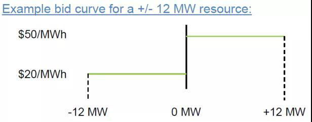 在電能量市場(chǎng)上,電儲(chǔ)能NGR可以提交電能量報(bào)價(jià)曲線,包括充電報(bào)價(jià)(-MW)和放電報(bào)價(jià)(+MW)(如下圖),這種報(bào)價(jià)曲線允許電儲(chǔ)能在一個(gè)單獨(dú)的報(bào)價(jià)中,反映其經(jīng)濟(jì)可行的運(yùn)行區(qū)間,儲(chǔ)能可以作為發(fā)電、負(fù)荷或者兩者同時(shí)參與市場(chǎng)。此外,電儲(chǔ)能也可以提交“價(jià)差報(bào)價(jià)”(spread bid)在電價(jià)處于報(bào)價(jià)區(qū)間之外進(jìn)行充電放電;或者自調(diào)度,只報(bào)量作為價(jià)格接受者。