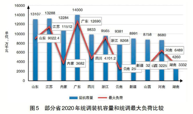電力電量是電力供求的動(dòng)態(tài)平衡,需要從兩個(gè)方面同時(shí)著手,才會(huì)有更好的效果。從供給側(cè)的角度,隨著特高壓電網(wǎng)的建設(shè),跨省跨區(qū)交易電量大幅度增加,不能把省外電力交易作為邊界條件后再進(jìn)行省內(nèi)電力電量平衡,要把省外交易納入本省電力供求,增加經(jīng)濟(jì)性原則,統(tǒng)籌優(yōu)化省內(nèi)電力電量平衡。根據(jù)《廣東省電力市場(chǎng)2019年年度報(bào)告》,2019年全省電網(wǎng)統(tǒng)調(diào)裝機(jī)容量1.26億千瓦,電網(wǎng)統(tǒng)調(diào)最大負(fù)荷1.22億千瓦;全省發(fā)受電量6581.6億千瓦時(shí),其中受電量1970.9億千瓦時(shí)。與廣東省統(tǒng)調(diào)裝機(jī)容量與電網(wǎng)統(tǒng)調(diào)最大負(fù)荷十分相近比較,有些電力受入省的統(tǒng)調(diào)裝機(jī)容量明顯大于統(tǒng)調(diào)最大負(fù)荷;盡管不能簡(jiǎn)單地?cái)喽ㄟ@些超出容量的固定成本和運(yùn)行維護(hù)費(fèi)就是多余的電力電量平衡成本,但是,至少提出了更大范圍優(yōu)化平衡成本的問(wèn)題。圖5比較了截至2020年10月部分省統(tǒng)調(diào)裝機(jī)容量和統(tǒng)調(diào)最大負(fù)荷,其中有些電力受入省的統(tǒng)調(diào)裝機(jī)容量和統(tǒng)調(diào)最大負(fù)荷差值得關(guān)注。