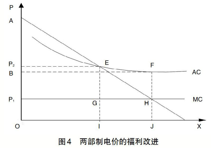由于電力生產(chǎn)與消費(fèi)的電能商品實(shí)際是電力,實(shí)施兩部制電價(jià),讓電力以容量電價(jià)或電費(fèi)的形式進(jìn)行生產(chǎn)和交易,顯然比按電力生產(chǎn)和消費(fèi)的電量結(jié)算更加科學(xué)合理。如圖4所示,為什么采用兩部制電價(jià)而不是單一電量電價(jià)?例如直接根據(jù)平均成本定價(jià),原因是因?yàn)閮刹恐齐妰r(jià)能夠獲得更大的社會(huì)福利,是比單一電量制電價(jià)更有效率的電價(jià)制度。假設(shè)根據(jù)平均成本實(shí)行單一電量電價(jià),由于需求曲線與平均成本曲線的交點(diǎn)為E,所以平均成本價(jià)格為P2,平均成本價(jià)格下能使市場(chǎng)出清的供應(yīng)量為OI。生產(chǎn)OI的總費(fèi)用為OP2EI,其中P1P2EG為固定費(fèi)用總額,OP1GI為變動(dòng)費(fèi)用總額。消費(fèi)者剩余為AP2E。如果采用兩部制定價(jià),電量電費(fèi)按邊際成本征收,價(jià)格為P1,供應(yīng)量為OJ,在產(chǎn)出為OJ時(shí),消費(fèi)者剩余為AP1H減去固定費(fèi)用總額P1BFH,因此,兩部制定價(jià)下的消費(fèi)者剩余也可以表示為AP1H減去P1P2EG,即容量電費(fèi),等于平均成本定價(jià)下的消費(fèi)者剩余AP2E加上EGH。因此,兩部制定價(jià)與平均成本定價(jià)相比,在電力企業(yè)收益不變的情況下,使消費(fèi)者剩余增加了EGH的面積,社會(huì)福利得到了改進(jìn)。