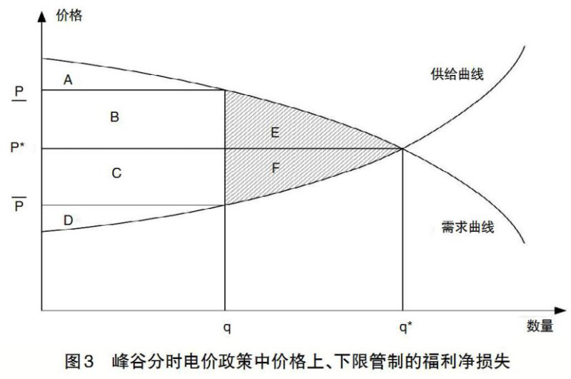 因此,目前我國(guó)峰谷電價(jià)政策做法是尖峰電價(jià)該高不高,低谷電價(jià)該低不低,這種做法實(shí)際上相當(dāng)于同時(shí)執(zhí)行了價(jià)格上限和價(jià)格下限。如圖3所示,在最高負(fù)荷時(shí)段,按照成本定價(jià)或市場(chǎng)均衡定價(jià)應(yīng)該為P*,結(jié)果按價(jià)格上限[P] 相反,在低谷負(fù)荷時(shí)段,按照成本定價(jià)或市場(chǎng)均衡定價(jià)應(yīng)該為P*,結(jié)果按價(jià)格下限定價(jià)為P。價(jià)格上、下限同時(shí)管制的結(jié)果造成了社會(huì)福利凈損失,等于2倍的圖中陰影線面積E+F。這個(gè)凈福利損失靜態(tài)看由電力企業(yè)和用戶分別承擔(dān),長(zhǎng)期看還是由用戶全部承擔(dān)。實(shí)際峰谷分時(shí)電價(jià)政策制定中把是否增加用戶電價(jià)或電費(fèi)作為政策執(zhí)行的依據(jù),而不考慮用戶用電的實(shí)際成本,這樣做不尊重客觀經(jīng)濟(jì)規(guī)律,短期看可能有利于這類(lèi)用戶,長(zhǎng)期看因?yàn)檫@樣做會(huì)形成第二條負(fù)荷曲線,電力企業(yè)要投入相對(duì)更多的生產(chǎn)能力滿足尖峰負(fù)荷需求,所產(chǎn)生的額外成本只會(huì)讓用戶承擔(dān)更高的電價(jià)或更多的電費(fèi)。因此,不按成本定價(jià)和支付電費(fèi)的結(jié)果是導(dǎo)致成本更大和電費(fèi)更高,表現(xiàn)為惡性循環(huán)效應(yīng)。