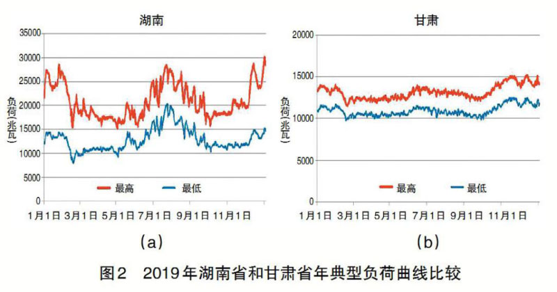 根據(jù)國(guó)家發(fā)改委公布的2019年各省級(jí)電網(wǎng)典型負(fù)荷曲線,各省都存在明顯的日最大負(fù)荷與最小負(fù)荷差,有些省相對(duì)較大,如湖南省全年的日最大負(fù)荷與最小負(fù)荷差約1倍左右,如圖2(a)所示;有些相對(duì)較小,如圖2(b)所示,甘肅省全年日最大負(fù)荷與最小負(fù)荷差約在0.5左右。