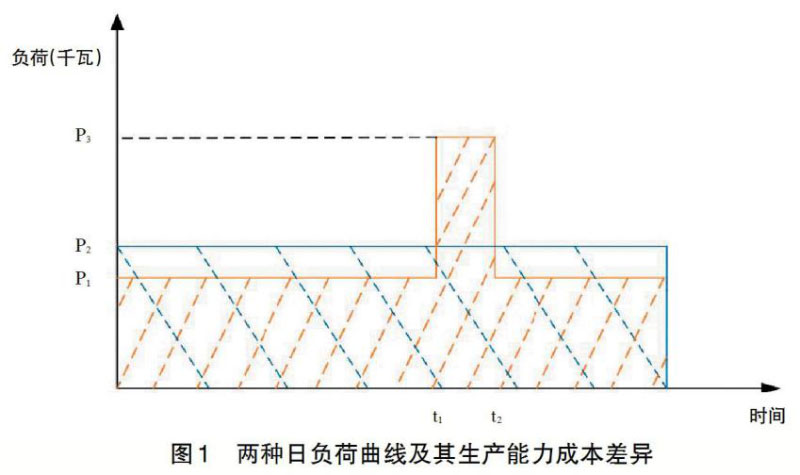 從用戶支付電費(fèi)或發(fā)電企業(yè)獲得銷(xiāo)售收入的角度,在目前我國(guó)電力市場(chǎng)改革和電價(jià)政策背景下,電力現(xiàn)貨市場(chǎng)改革還僅停留在試點(diǎn)階段,僅有大工業(yè)用電按兩部制付費(fèi),并且容量電費(fèi)的比例較低,可以認(rèn)為,目前我國(guó)電費(fèi)主要按電量支付。實(shí)際生產(chǎn)和消費(fèi)的是電力,而電費(fèi)支付卻以電量為依據(jù),這樣就產(chǎn)生了矛盾。如圖1所示,圖中有兩條簡(jiǎn)化的日負(fù)荷曲線,第一條日負(fù)荷曲線負(fù)荷率為100%,日負(fù)荷24小時(shí)內(nèi)始終為P2;第二條日負(fù)荷曲線由三段水平負(fù)荷組成,最高負(fù)荷為P3,平段負(fù)荷為P1。假設(shè)兩條曲線下的面積即電量相等,即用戶支付的電費(fèi)相同,這樣,P2相當(dāng)于第二條負(fù)荷曲線的平均負(fù)荷。假設(shè)P3為P1的2倍,t1-t2=2小時(shí),同時(shí)忽略大工業(yè)用電中的容量電費(fèi)。在兩條不同的日負(fù)荷曲線下,用戶消費(fèi)的電能商品和支付的電費(fèi)相同,但是,電力企業(yè)生產(chǎn)電能的成本卻完全不同。由于電力企業(yè)的投資成本與最大負(fù)荷水平成正比例關(guān)系,第二條日負(fù)荷曲線下電力企業(yè)的投資成本根據(jù)上面的假設(shè),可以計(jì)算是第一條負(fù)荷曲線的投資成本的1.85倍(2×24/26)。由于電力工業(yè)資本密集,1.85倍投資成本差異巨大。這個(gè)結(jié)果說(shuō)明了兩個(gè)重要結(jié)論:第一,由于這種成本的差異源于不同的負(fù)荷曲線或者電力分布,因此,電力企業(yè)生產(chǎn)和用戶消費(fèi)的電能商品其實(shí)不是電量而是電力。第二,存在基于負(fù)荷曲線的成本最小的最優(yōu)電力生產(chǎn)和消費(fèi)的問(wèn)題,從圖1中可以直觀地看出,電力負(fù)荷曲線越平緩,或者說(shuō)最大負(fù)荷與最小負(fù)荷差越小,電力生產(chǎn)與消費(fèi)就越經(jīng)濟(jì)。圖1中第一條負(fù)荷曲線能夠?qū)崿F(xiàn)最小投資成本的生產(chǎn)和消費(fèi)。通過(guò)調(diào)整用戶的用電負(fù)荷分布,比如將第二條負(fù)荷曲線調(diào)整為第一條或者接近于第一條負(fù)荷曲線,可以相對(duì)減少電力企業(yè)的投資成本,在電力企業(yè)利益不變的前提下降低電價(jià)。