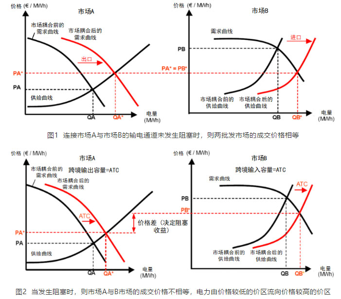 日前市場聯(lián)合出清不考慮各國(價(jià)區(qū))內(nèi)部輸電阻塞,僅考慮跨國(價(jià)區(qū))之間的輸電線路容量限制。由TSO向電力交易機(jī)構(gòu)發(fā)布跨境傳輸通道的可用傳輸容量(Available Transmission Capacity,ATC)。市場A和市場B的市場成員各自提交報(bào)價(jià),使用該傳輸容量作為約束進(jìn)行統(tǒng)一優(yōu)化出清,得到各自市場的成交電量及價(jià)格。在區(qū)域間有阻塞和無阻塞情況下各市場出清曲線如下圖所示: