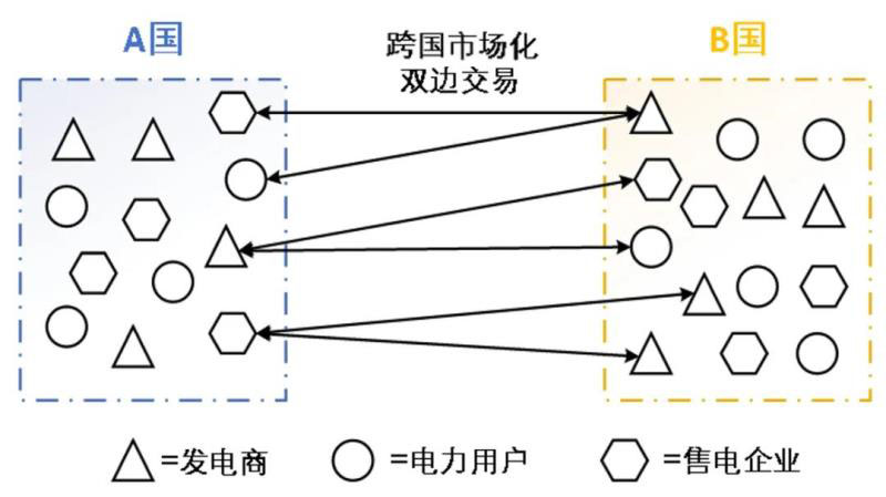 二是由兩國(guó)發(fā)電企業(yè)、電力用戶、售電公司等市場(chǎng)主體進(jìn)行直接對(duì)接協(xié)商,開展電力交易。協(xié)議達(dá)成后,市場(chǎng)主體應(yīng)將協(xié)議在規(guī)定的時(shí)間內(nèi)提交至所在國(guó)家或地區(qū)的電力調(diào)度、交易機(jī)構(gòu)。市場(chǎng)化雙邊交易示意如圖2所示。