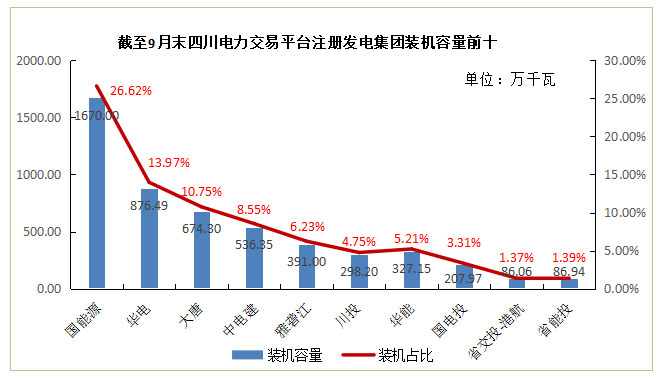 從裝機(jī)規(guī)模來(lái)看,國(guó)家能源集團(tuán)、華電集團(tuán)、大唐集團(tuán)裝機(jī)規(guī)模排名靠前,裝機(jī)容量分別為1670.0萬(wàn)千瓦、876.49萬(wàn)千瓦、674.3萬(wàn)千瓦,分別占四川電力交易平臺(tái)注冊(cè)總裝機(jī)的26.5%、13.5%、10.7%。