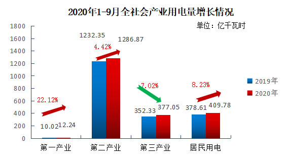 第一產(chǎn)業(yè)用電量12.24億千瓦時(shí),同比增長(zhǎng)22.12%;第二產(chǎn)業(yè)用電量1286.87億千瓦時(shí),同比增長(zhǎng)4.42%;第三產(chǎn)業(yè)用電量377.05億千瓦時(shí),同比減少7.02%;居民生活用電量409.78億千瓦時(shí),同比增長(zhǎng)8.23%。