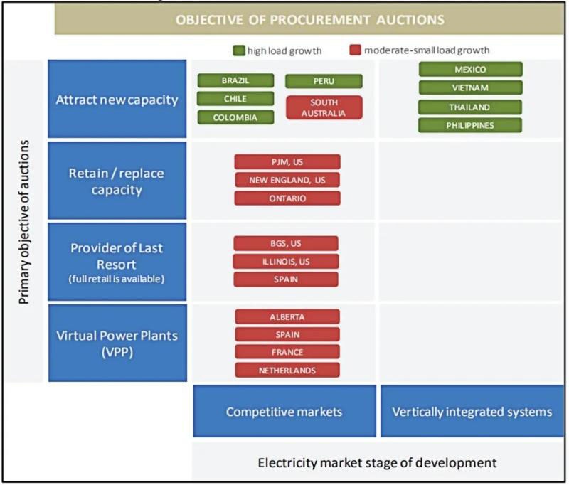 電力行業(yè)也廣泛地應(yīng)用各種各樣的拍賣(mài)方式作為交易方式,例如許多發(fā)展中國(guó)家就針對(duì)電廠和輸電資產(chǎn)的特許經(jīng)營(yíng)權(quán)運(yùn)用了第一價(jià)格暗標(biāo)拍賣(mài),而電力市場(chǎng)集中競(jìng)價(jià)交易中常談到的統(tǒng)一出清以及按報(bào)價(jià)支付(Pay as Bid)實(shí)質(zhì)也是兩種拍賣(mài)方式,美國(guó)、西班牙、哥倫比亞等國(guó)則在容量市場(chǎng)采用“荷式時(shí)鐘拍賣(mài)”。