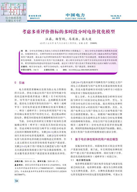 摘要:分時電價策略是當(dāng)前電力系統(tǒng)需求側(cè)管理的主要措施之一,執(zhí)行分時電價能夠有效降低負(fù)荷波動,實現(xiàn)削峰填谷。合理開展峰谷雙時段或峰平谷3時段分時電價策略的選擇有利于提高電網(wǎng)供電可靠性和用戶滿意度。提出基于電價彈性矩陣的用戶響應(yīng)模型并定量計算用戶綜合滿意度,根據(jù)相應(yīng)模型分別求解負(fù)荷峰值、負(fù)荷峰谷差以及用戶綜合滿意度,建立峰谷分時電價與峰平谷分時電價的多重評價指標(biāo)模型,利用所提指標(biāo)構(gòu)造電價優(yōu)化的目標(biāo)函數(shù)。通過對3類用戶進行仿真計算驗證所提方法的正確性與有效性。