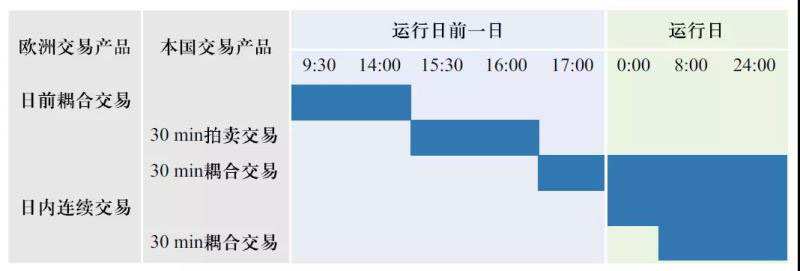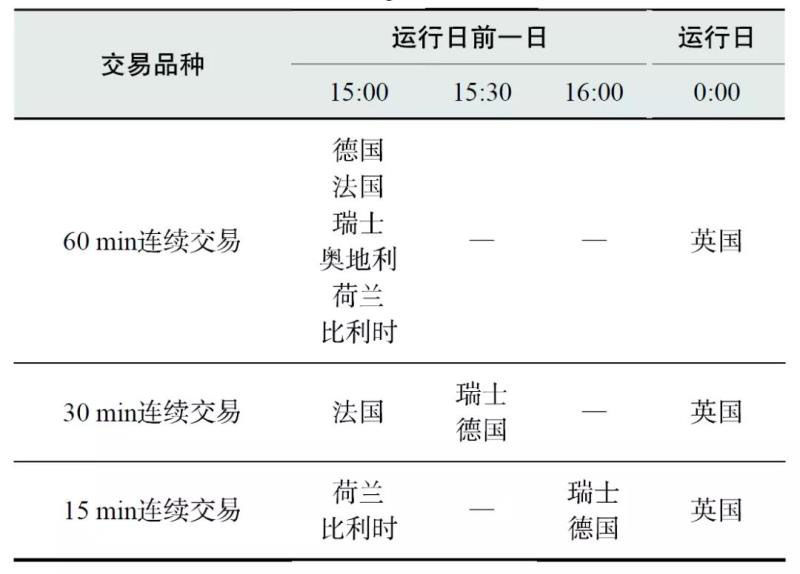 日內(nèi)連續(xù)交易市場(chǎng)針對(duì)各國(guó)交易體系的特點(diǎn)共設(shè)置了60分鐘連續(xù)交易、30分鐘連續(xù)交易及15分鐘連續(xù)交易三個(gè)交易產(chǎn)品,所有產(chǎn)品于運(yùn)行日前一日15:00時(shí)開始,連續(xù)交易直至運(yùn)行日各國(guó)市場(chǎng)交割前。市場(chǎng)交易時(shí)序如表1所示。