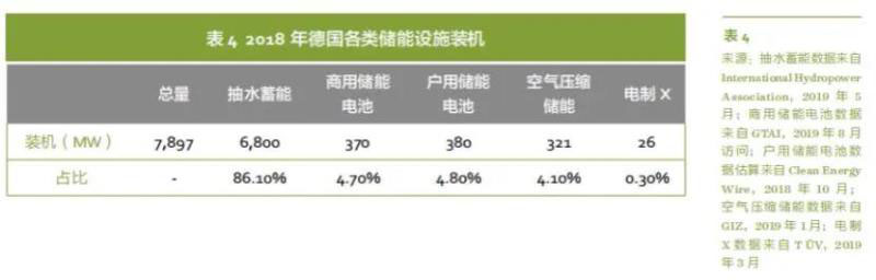 德國(guó)儲(chǔ)能設(shè)施主要包括抽水蓄能、電池儲(chǔ)能、壓縮空氣儲(chǔ)能(CAES)以及電制 X (PtX)。截至 2018 年,德國(guó)儲(chǔ)能裝機(jī)容量已達(dá)到近 790 萬千瓦,主要為電力系統(tǒng)提供快速和短期的靈活性服務(wù),其中抽水蓄能仍然是德國(guó)目前裝機(jī)容量最大、經(jīng)濟(jì)性最好的儲(chǔ)能設(shè)施;隨著技術(shù)的發(fā)展和成本降低,電池儲(chǔ)能也開始進(jìn)入到大型商業(yè)化應(yīng)用階段,技術(shù)類型和商業(yè)模式逐漸多樣化;壓縮空氣儲(chǔ)能具有靈活性高且運(yùn)行穩(wěn)定的優(yōu)勢(shì),但由于建設(shè)條件較為苛刻,目前德國(guó)僅有一個(gè)商業(yè)化運(yùn)行項(xiàng)目;當(dāng)前電制 X 在德國(guó)還處在小規(guī)模試驗(yàn)階段,預(yù)計(jì) 2020 年后才會(huì)陸續(xù)實(shí)現(xiàn)大規(guī)模商業(yè)化運(yùn)行。